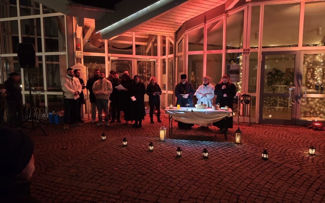 Trotz des Windes und der Kälte konnten wir gemeinsam ein besinnliches Miteinander erleben. Unterstützt vom orthodoxen Chor der Gemeinde St. Paulus klangen die Lieder auch ohne Instrumentalbegleitung festlich.